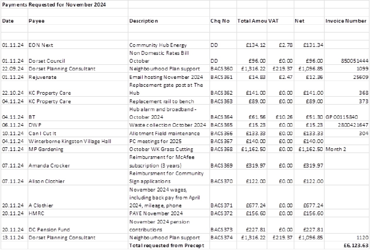 MINUTES OF THE LOWER WINTERBORNE PARISH COUNCIL MEETING HELD ON TUESDAY 19th NOVEMBER 2024, COMMENCING 7PM, AT WINTERBORNE KINGSTON VILLAGE HALL